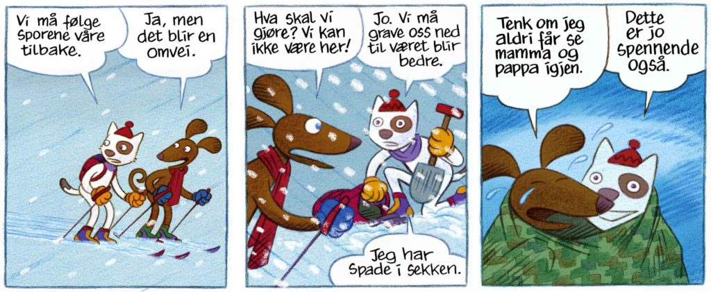 Bisk ønsker å være flink, men her har Siss mye mer erfaring. Og viser seg mye bedre forberedt når de kommer i fare. For det blir jo spenning og dramatikk etter hvert, i tillegg til mye lun humor. Mens foreldrene forbereder matpausen lar jeg Bisk og Siss gå en liten avstikker på egen hånd utenom løypa. De leker polarfarere og gir seg ikke før de er oppe på en topp.