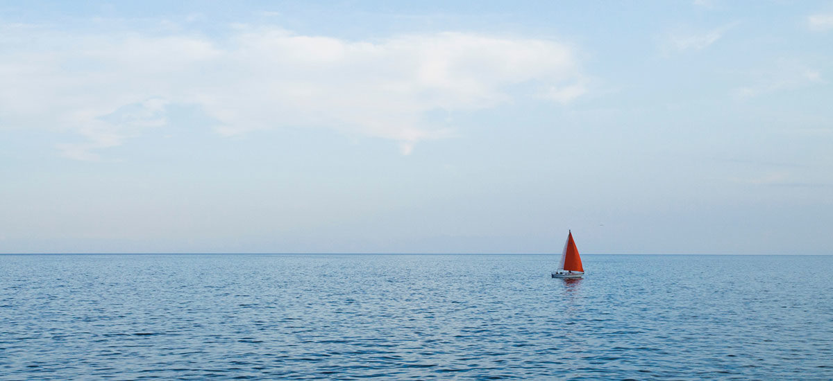 Liten seilbåt med rødt seil alene på vannet - Illustrasjonsfoto