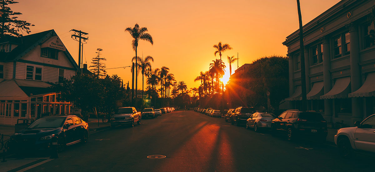 Froskeperspektiv av en gate under solnedgangen